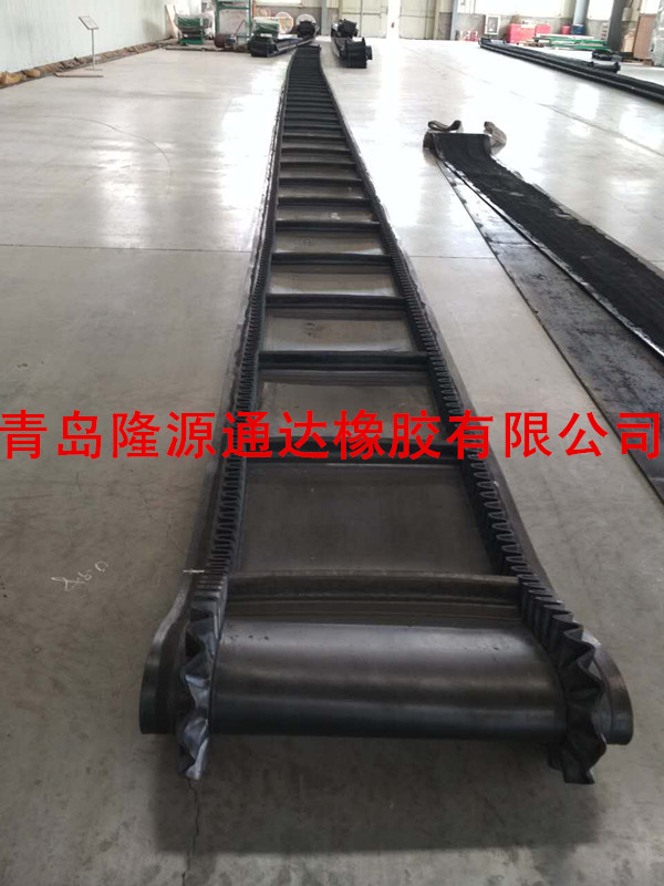大傾角輸送帶一般和波狀擋邊輸送機(jī)配合使用,其使用角度一般>=30℃,也可和輸送帶式輸送機(jī)配套使用,水平短距離輸送(此時(shí)一般不設(shè)隔板)波形擋邊輸送帶采用成槽度不大于0.03的基帶和擋邊,橫隔板(水平輸送可不要),經(jīng)兩次硫化制成。